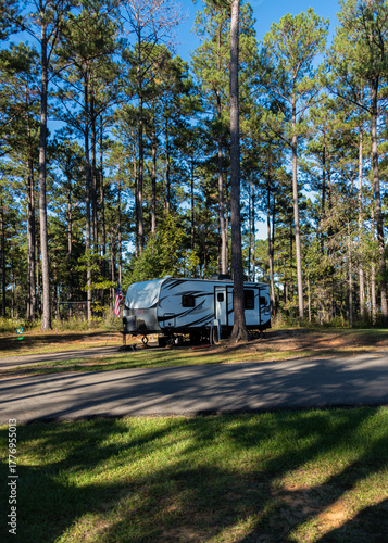 © Larry D Crain, Obraz premium A trailer is parked in a scenic forest campground surrounded by tall pine trees. The peaceful setting suggests a perfect escape in nature.