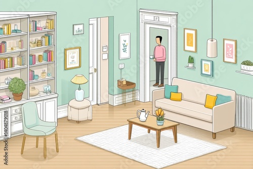 Fototapeta premium A train arriving into a living room as a person calmly makes tea