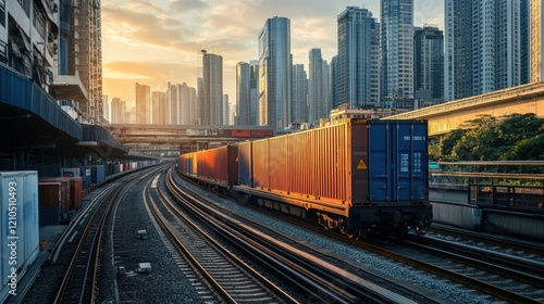 © Prakakrong, Fototapeta premium A train carrying cargo containers through a city, with urban skyscrapers in the background, showing the integration of rail transport in city logistics