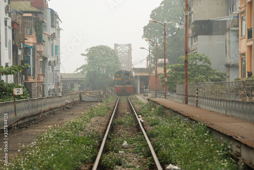 © Ilona, Naklejka premium A train going from Train Street on Long Bien Bridge in Hanoi, Vietnam