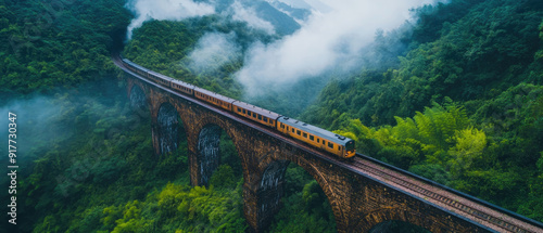 © Hound, Fototapeta premium A train is running on an old stone bridge in the mountains, surrounded by green forests and misty clouds
