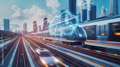 Naklejka premium A train is shown with a cloud on it, and it is traveling down a track