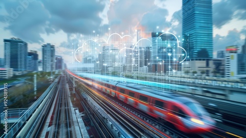 © G.Go, Fototapeta premium A train is speeding down a track with a city in the background