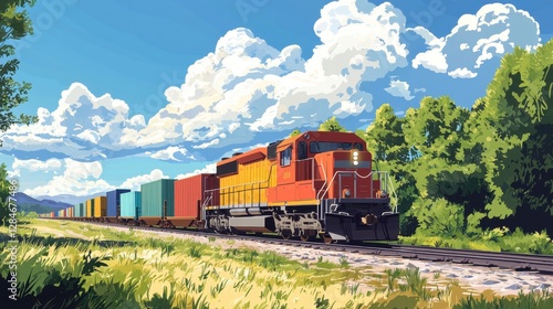 © mila103, Obraz premium A train is traveling down a track with a lush green forest in the background