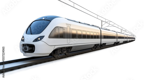 © Aklima, Fototapeta premium A train is traveling down the tracks with its lights on. The train is long and white. The train is moving fast and is surrounded by a snowy landscape