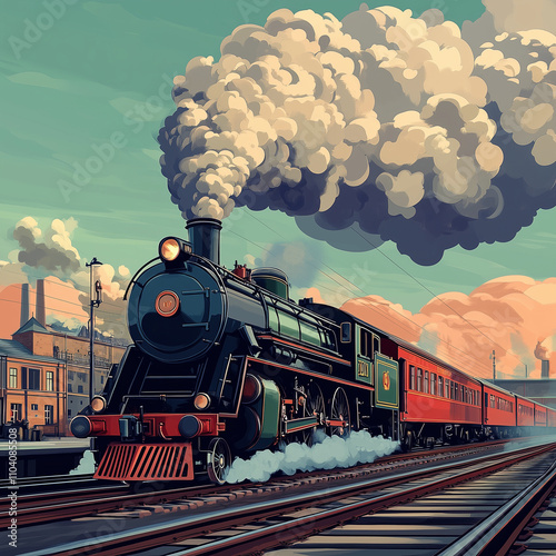 © cjsolanop, Obraz premium A train is traveling down the tracks with smoke coming out of the engine. The train is surrounded by buildings and a cloudy sky