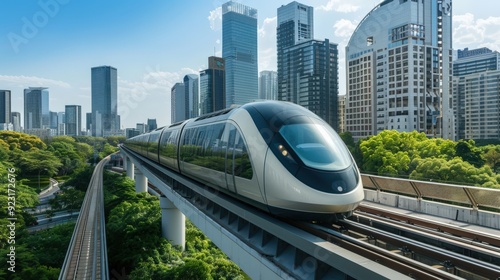 © G.Go, Naklejka premium A train is traveling through a city with tall buildings in the background