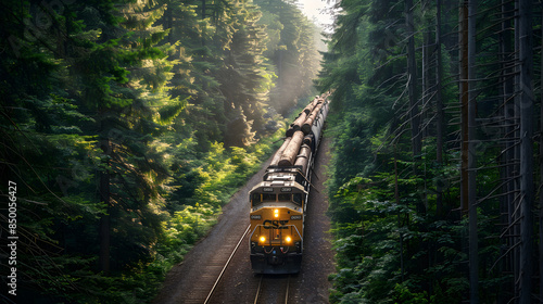 Fototapeta premium A train is traveling through a forest with trees and logs on the tracks