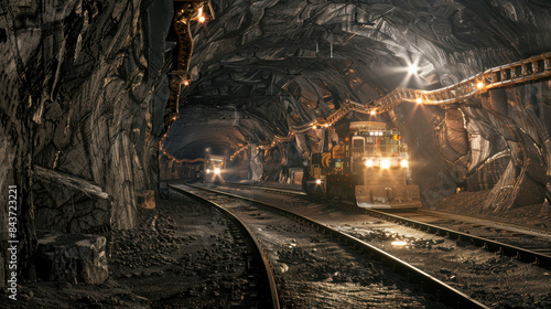 © Napat.T, Fototapeta premium A train is traveling through a tunnel in a dark, gloomy cave