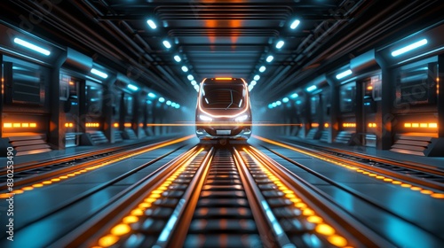 Fototapeta premium A train passing through a tunnel adorned with numerous yellow and blue lights...