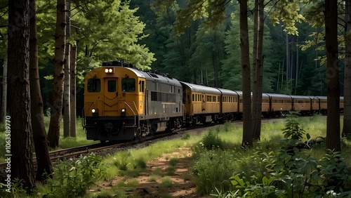 Fototapeta premium A train passing through a woodland on railroad tracks
