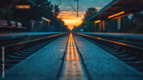 Fototapeta premium A train platform at dusk, the rails stretching toward the horizon with the light of the setting sun.