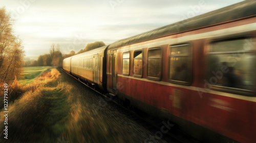 Naklejka premium A train races through a quiet countryside, with passengers gazing out the...