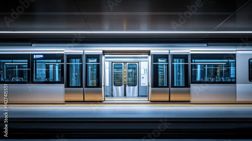 © BOW_NAPASORN, Fototapeta premium A train station with a silver train with the doors open. The station is empty and quiet