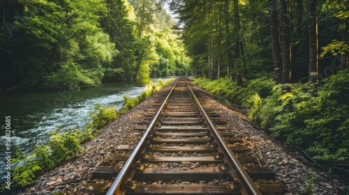 Fototapeta premium A train track runs through a dense forest next to a serene river