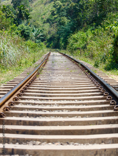 Fototapeta premium A train track with a green forest in the background