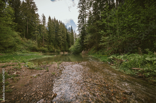 © Дмитро Григорчак, Naklejka premium A train traveling down train tracks near a forest