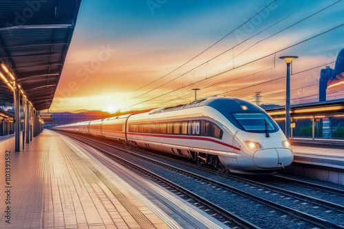 Naklejka premium A train with yellow and white stripes is traveling down the tracks