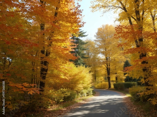 © Chanchai, Obraz premium A tranquil alley surrounded by vibrant autumn foliage with sunlight filtering through the trees, relaxation, scenic