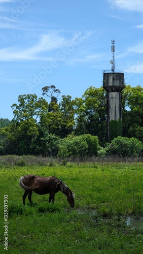 Fototapeta premium A tranquil and serene rural scene showcases a grazing horse alongside a telecom tower amidst lush, vibrant greenery