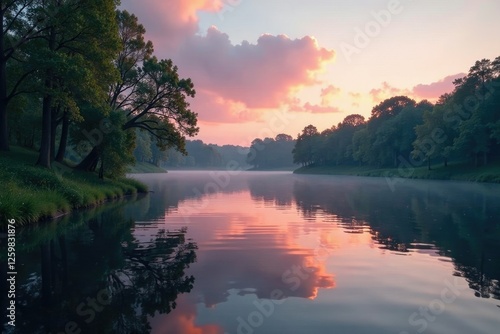 © Sathaporn Buarabut, Fototapeta premium A tranquil atmosphere is created by the gentle ripples on the pond's surface in soft evening hues, clouds, foliage