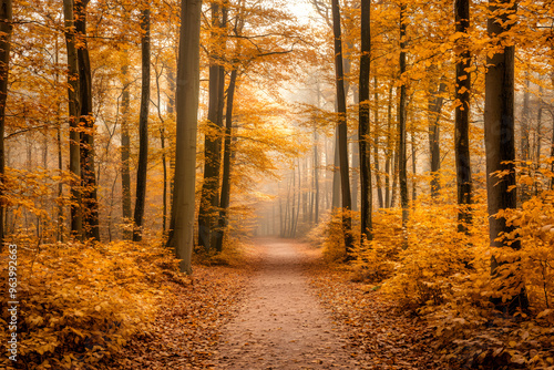 Fototapeta premium A tranquil autumn forest path surrounded by golden trees and bathed in soft...