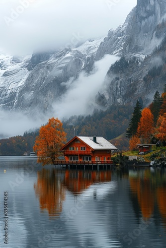 Fototapeta premium A tranquil autumn lake scene with a cozy wooden cabin surrounded by vibrant...