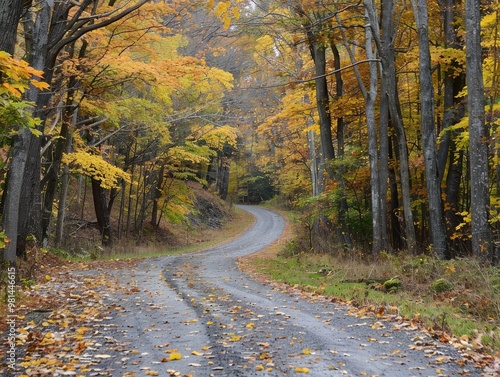 © Sebastian Studio, Obraz premium A tranquil autumn road through the forest at sunset.