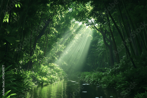Obraz premium A tranquil bamboo forest with light rays piercing through the dense greenery.