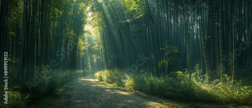 Fototapeta premium A tranquil bamboo forest with sunlight filtering through, a winding path,...