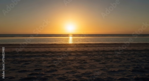 Obraz premium A tranquil beach scene showcases a vibrant sunset over calm waters. Sand in...