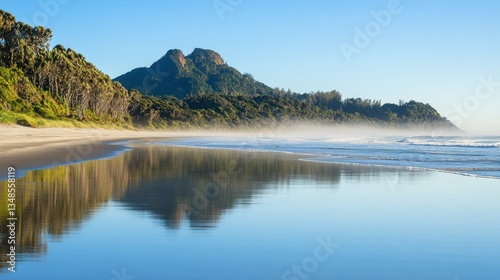 © ida, Fototapeta premium A tranquil beach scene with mountains and water reflections