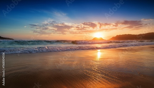 Naklejka premium A tranquil beach sunset with waves gently lapping at the shore.