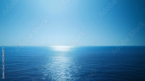 © Rashidi, Fototapeta premium A tranquil blue gradient at sea, capturing the calmness of dawn over the endless horizon background