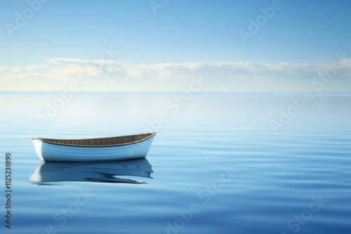 Naklejka premium A tranquil boat drifts on still water under a clear sky, creating a serene...