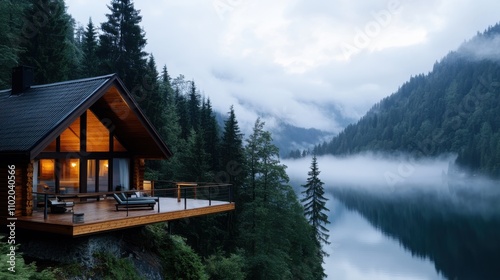 © Pinklife, Fototapeta premium A tranquil cabin nestled in nature, overlooking a serene lake and surrounded by a misty forest, offering a peaceful retreat in the heart of the wilderness.
