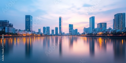 © Tanakorn, Obraz premium A tranquil city skyline reflected in calm waters at sunset, showcasing modern architecture and beautiful lighting.
