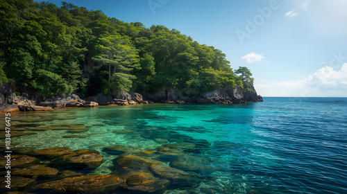 Fototapeta premium A tranquil coastal forest meets turquoise waters high-resolution photo