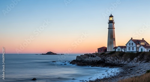 Naklejka premium A tranquil coastal scene at sunrise, featuring a majestic lighthouse standing...