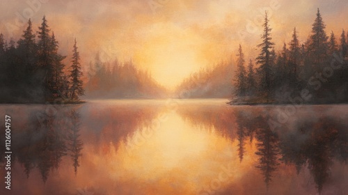 © Napasnan, Fototapeta premium A tranquil depiction of a sunrise over a misty lake, with soft abstract ripples and reflections blending in warm tones