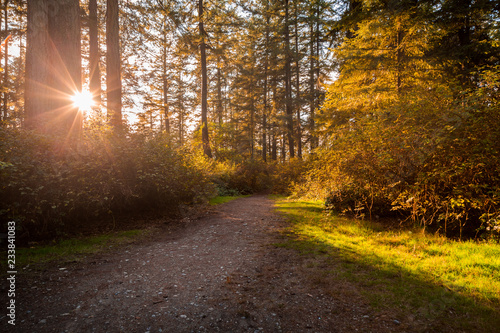 © Adam, Fototapeta premium A tranquil dirt path in a forest with the sun shining through the trees.