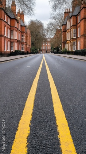 Fototapeta premium A tranquil early morning scene unfolds on a deserted street adorned with yellow lines, framed by charming Victorian buildings in a peaceful neighborhood