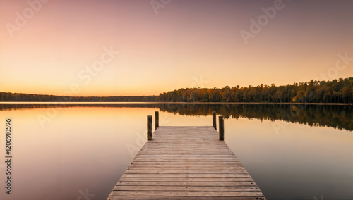 Naklejka premium A tranquil evening on a wooden dock overlooking a serene lake