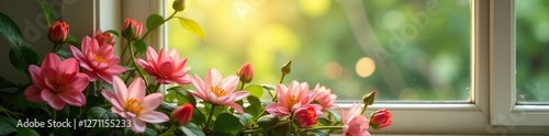 © Pusit, Fototapeta premium A tranquil flower bed near a window with natural light, window, relaxation, tranquility