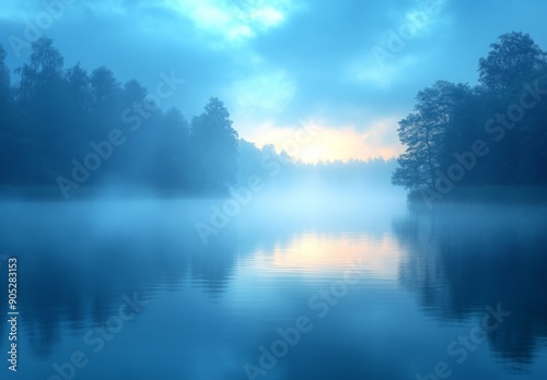 Fototapeta premium A tranquil foggy lake scene at dawn, with soft light filtering through the...