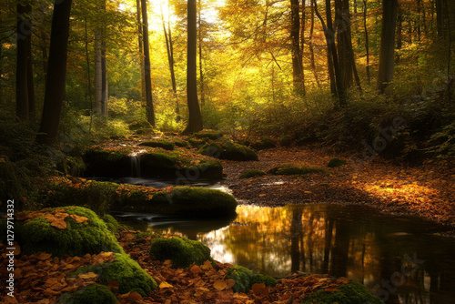 © AI_images, Obraz premium A tranquil forest clearing bathed in golden autumn light, where fallen leaves cover the ground and a small stream meanders through moss covered rocks.