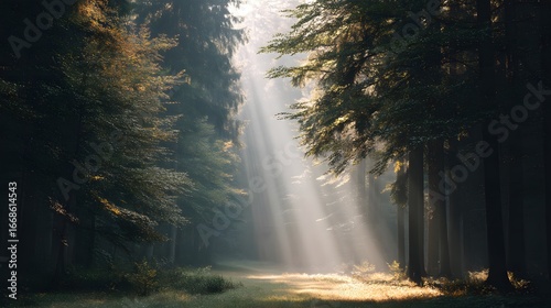 © Macrology, Fototapeta premium A tranquil forest clearing with soft sunlight rays