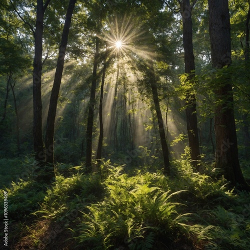© Muhammad, Obraz premium A tranquil forest clearing with sunlight streaming through the canopy.