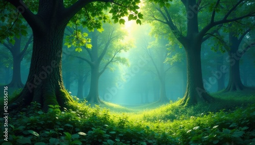 Obraz premium A tranquil forest glade bathed in dappled light, blue, green, peaceful