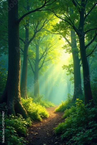 © Pawina, Obraz premium A tranquil forest glade bathed in dappled light, gradient, nature